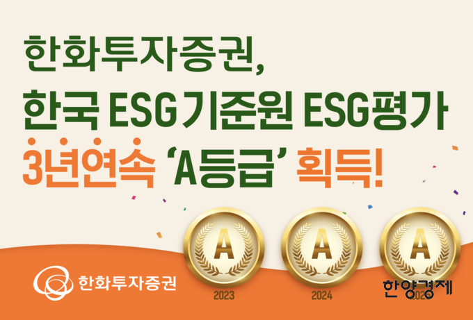한화투자증권은 한국ESG기준원(KCGS)이 주관하는 ESG 평가에서 3년 연속 통합 A등급을 획득했다고 20일 밝혔다.