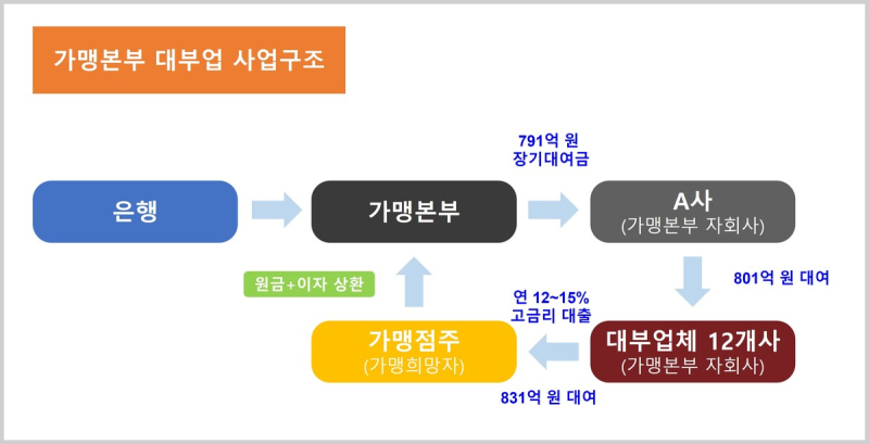 이 가맹본부 대표는 가맹본부 자회사인 육류도소매업체 A사에 연 4.6%로 791억 5천만원을 대여하면, A사가 다시 가맹본부와 특수 관계에 있는 대부업체 12곳에 연 4.6%로 801억 1천만원을 추가로 빌렸다. 이후 대부업체들은 가맹(희망) 점주들에게 2021년 11월부터 2023년 12월 말까지 연 12~15%의 고금리로 831억 3천600만원을 빌려주면서 부당한 이익을 취한 것으로 나타났다.